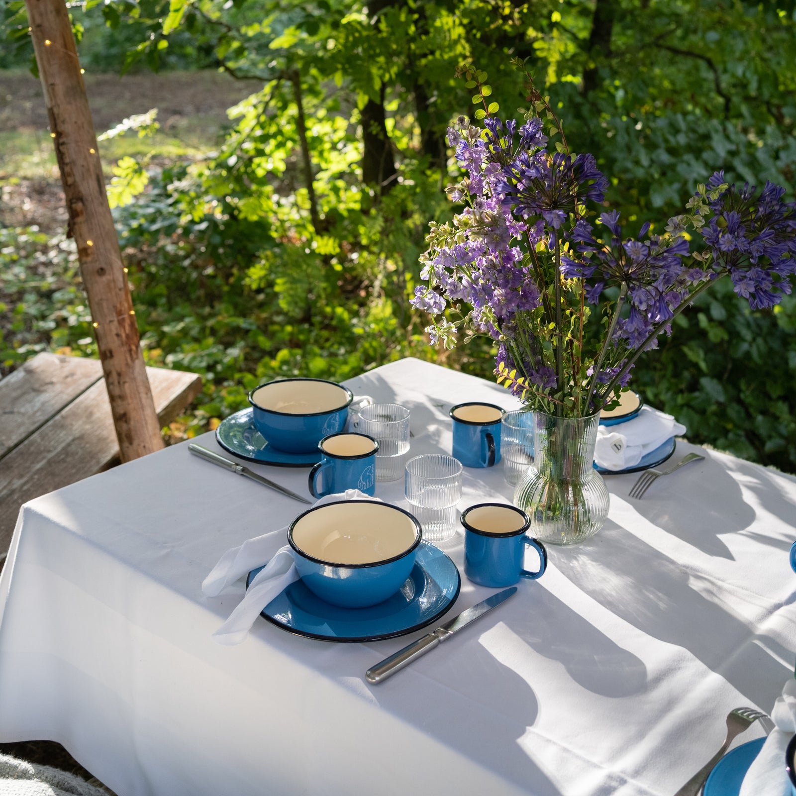 Ich habe es geliebt, während der Erntezeit dort zu sein – umgeben von vielen Menschen, Gelächter, Neckereien, alle waren draußen und mit jeder Menge positiver Energie. Mehrmals am Tag wurden die Erntehelfer mit Kaffee und Snacks verwöhnt und alle jüngeren, wie ich selbst damals, haben selbstgemachte Holunderlimonade bekommen. Alle Portionen wurden in Madam Blå Bechern serviert und der Kaffee wurde aus den blauen Kaffeekannen ausgeschenkt.